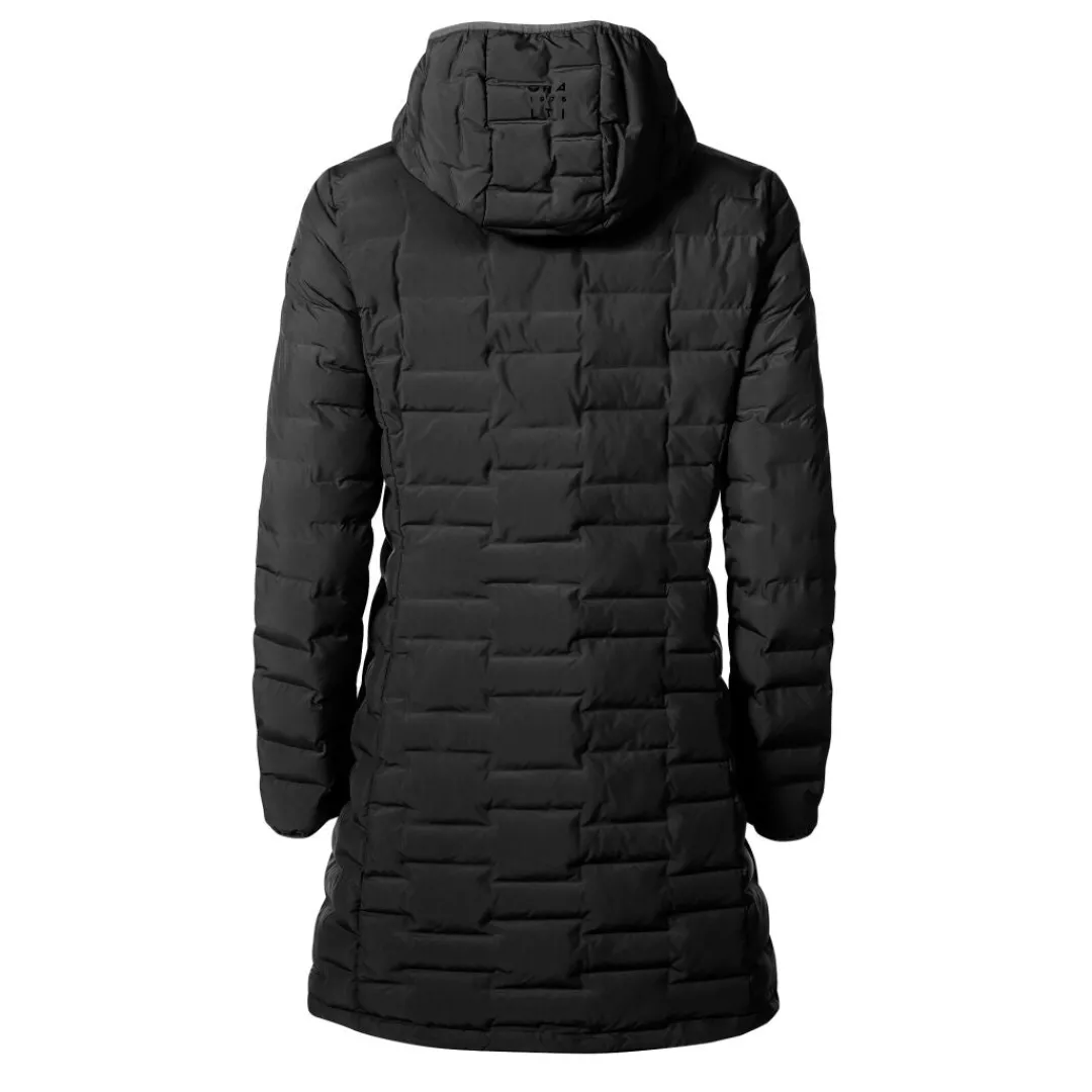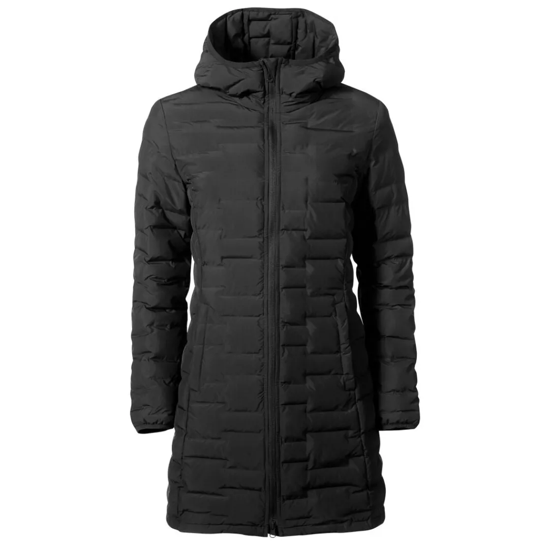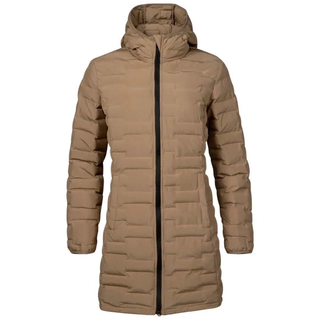Naisten topattu takki untuvan kaltaisella vanulla. Tämä pidempi helmainen takki sopii jokapäiväiseen käyttöön syksyn ja alkutalven kylmeneviin päiviin.