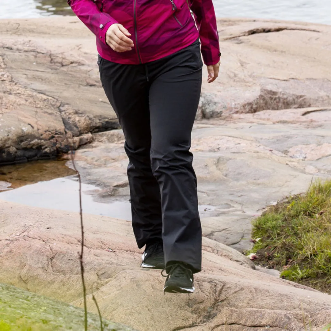 Erinomaisen istuvuuden tuo joustava vyötärörakenne, jossa on myös nyörikiristys. Suora lahje suojaa myös nilkkaa. Sivuilta löydät kaksi vetoketjullista taskua, joihin saat tärkeimmät tavarat myös suojaan kosteudelta. Nämä vedenpitävät housut on siis suunniteltu ottaen huomioon kaiken mitä tarvitset monikäyttöisiltä suosikkihousuilta!